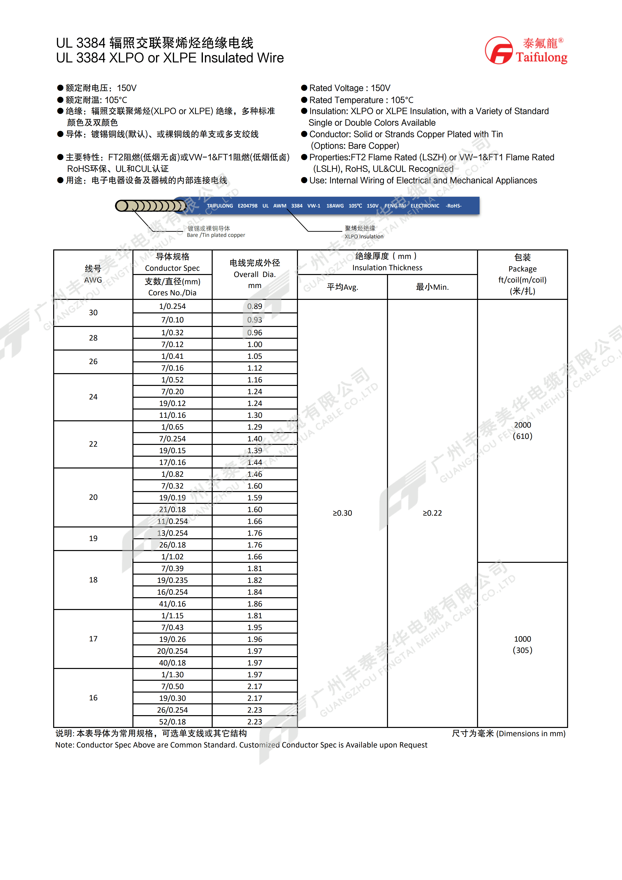 | 线号 AWG | 导体规格 | 电线完成外径 mm | 绝缘厚度(mm) | 包装 (米/扎) | |