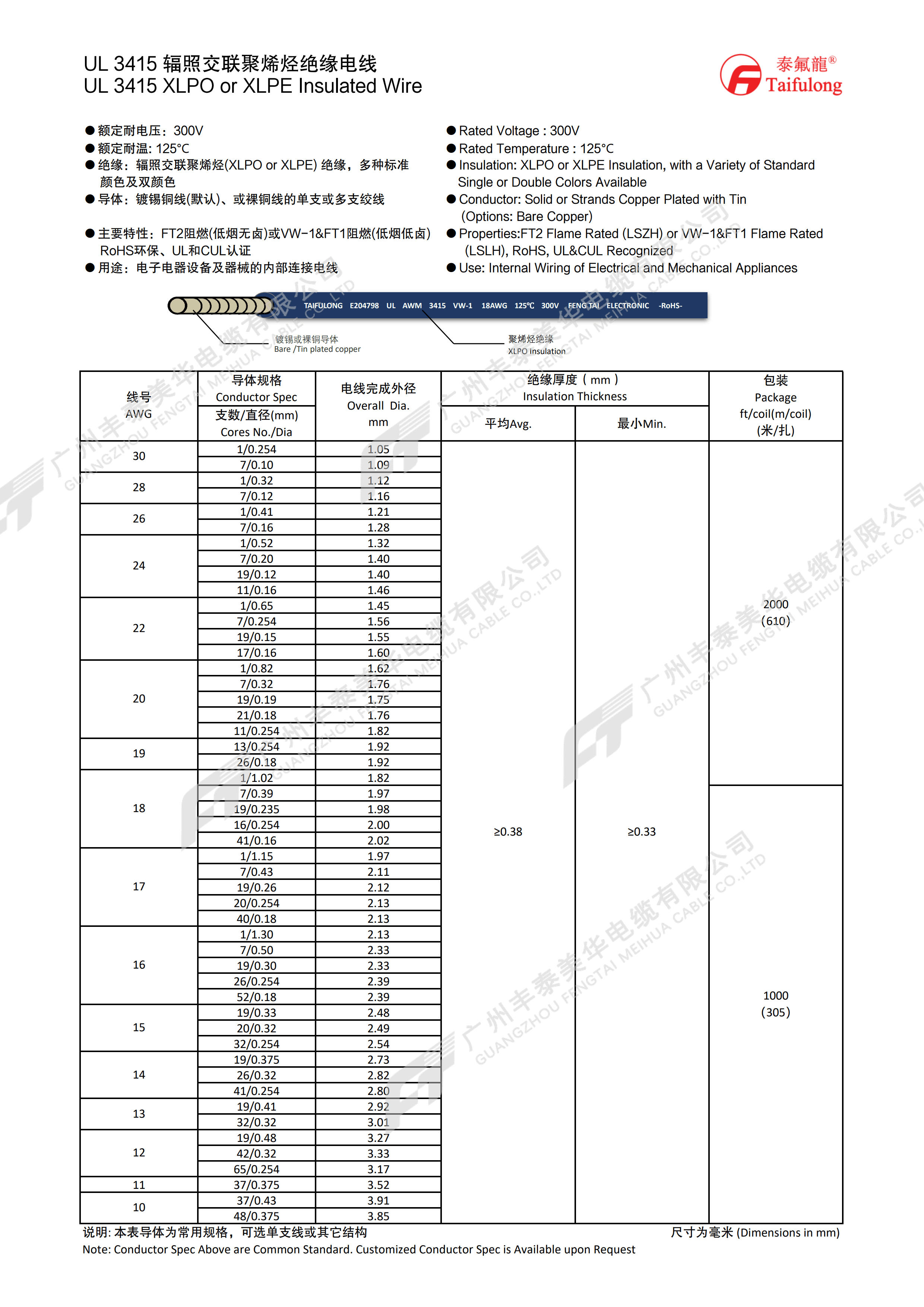 | 线号 AWG | 导体规格 | 电线完成外径 mm | 绝缘厚度(mm) | 包装 (米/扎) | |