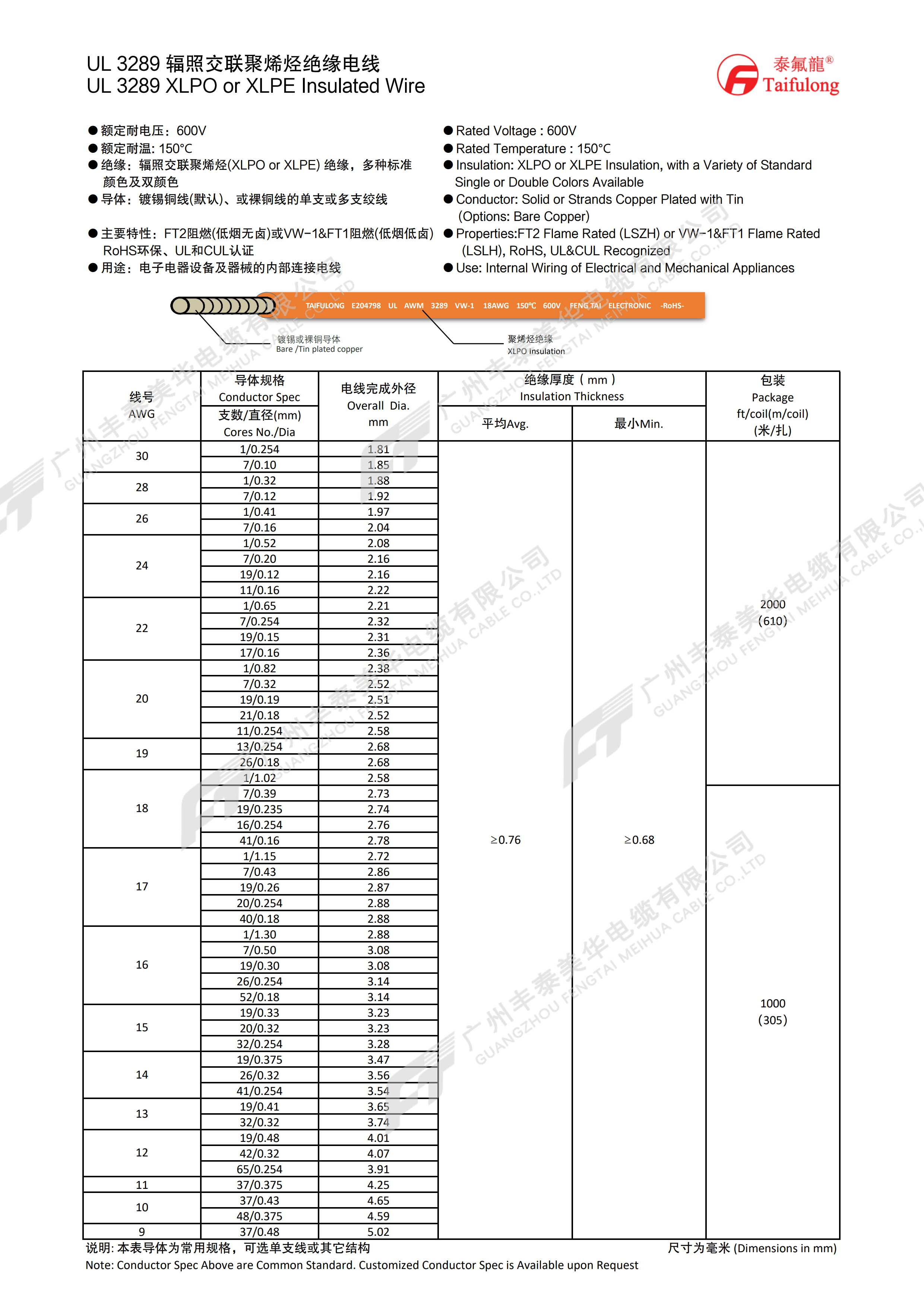 | 线号 AWG | 导体规格 | 电线完成外径 mm | 绝缘厚度(mm) | 包装 (米/扎) | |