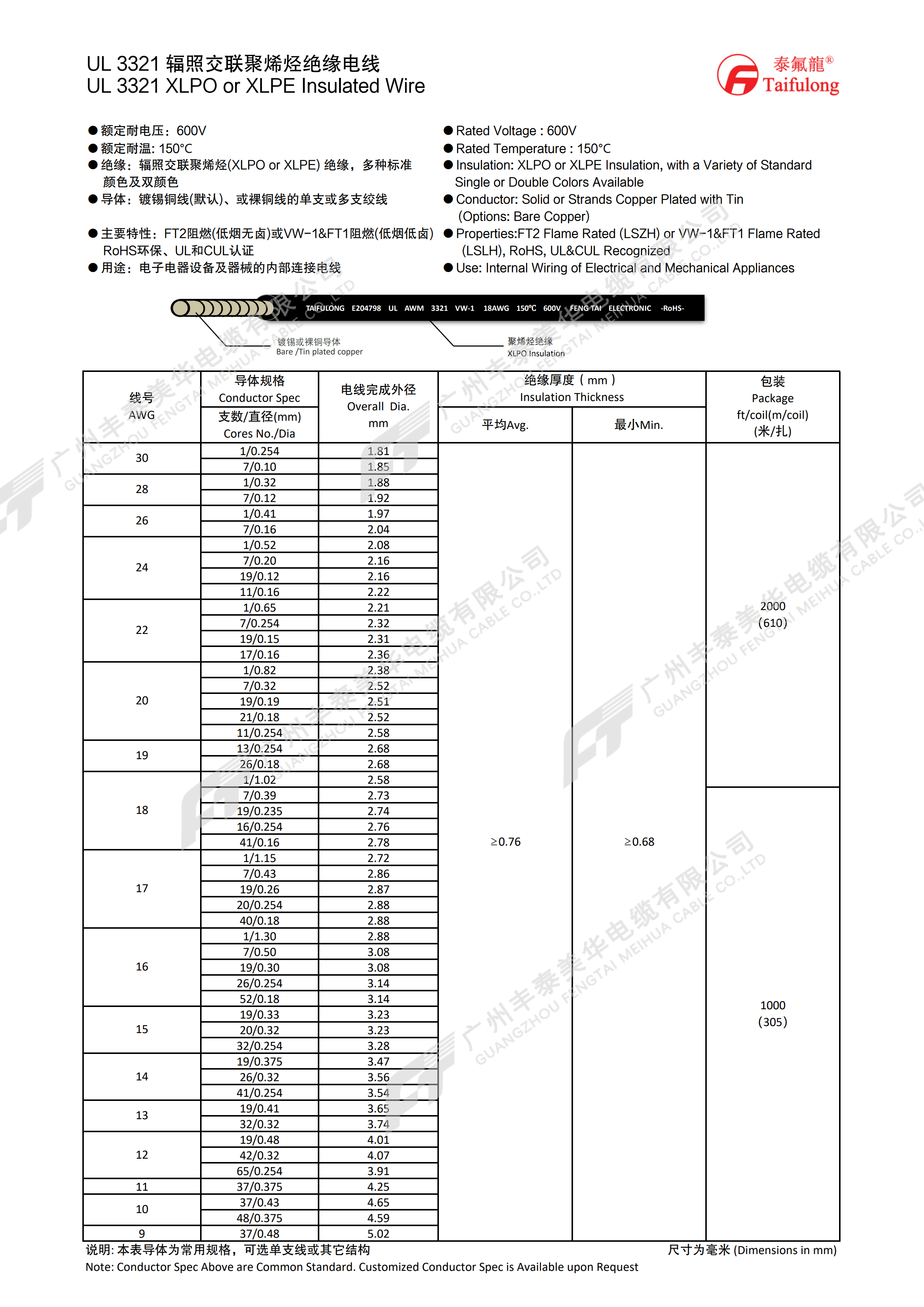 | 线号 AWG | 导体规格 | 电线完成外径 mm | 绝缘厚度(mm) | 包装 (米/扎) | |