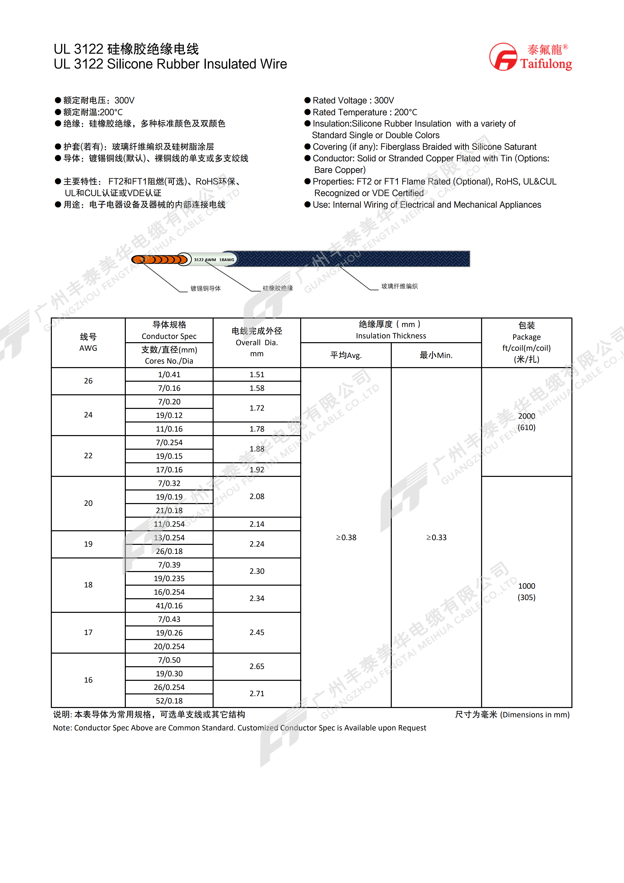 | 线号 AWG | 导体规格 | 电线完成外径 mm | 绝缘厚度(mm) | 包装 (米/扎) | |