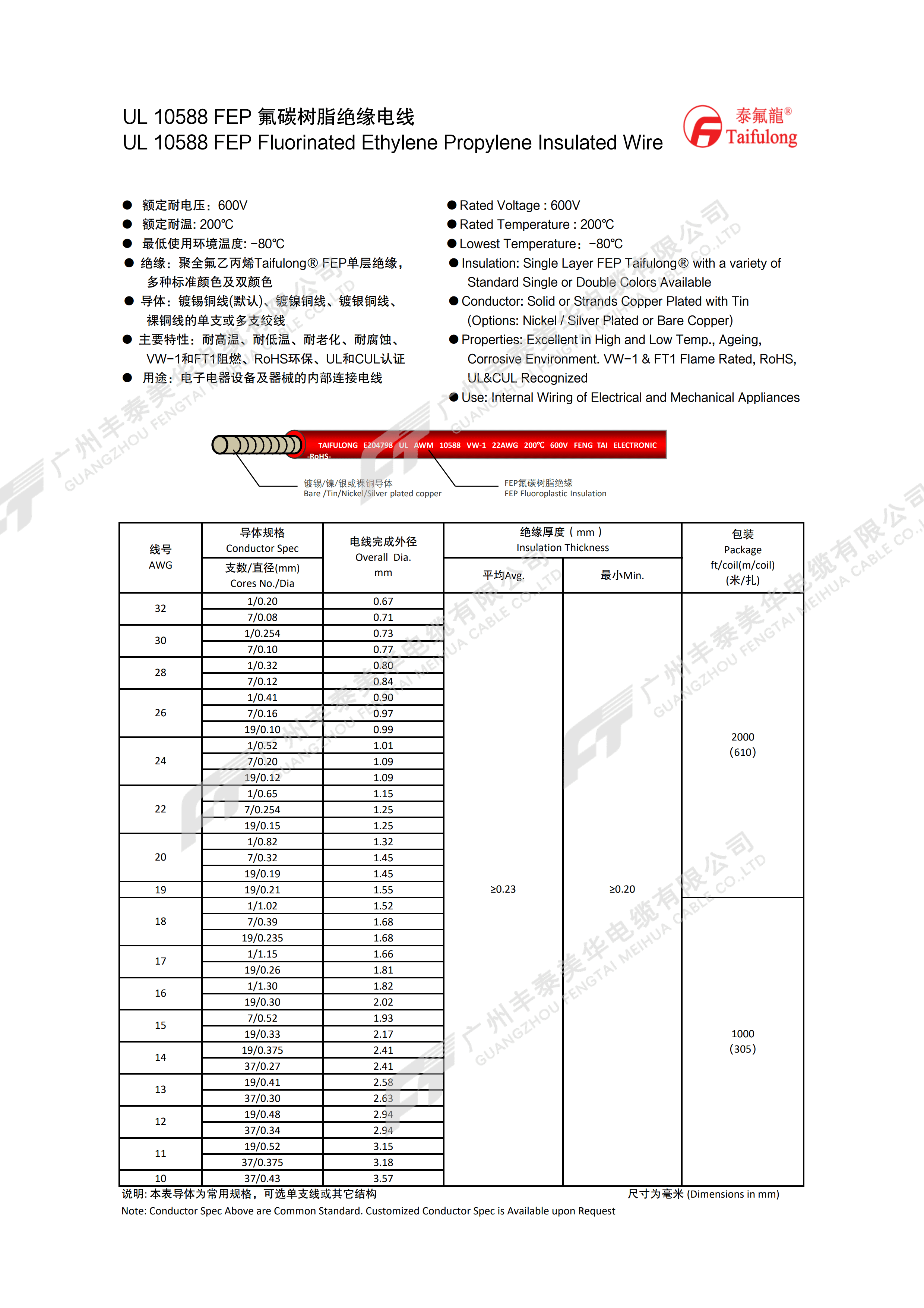 | 线号 AWG | 导体规格 | 电线完成外径 mm | 绝缘厚度(mm) | 包装 (米/扎) | |
