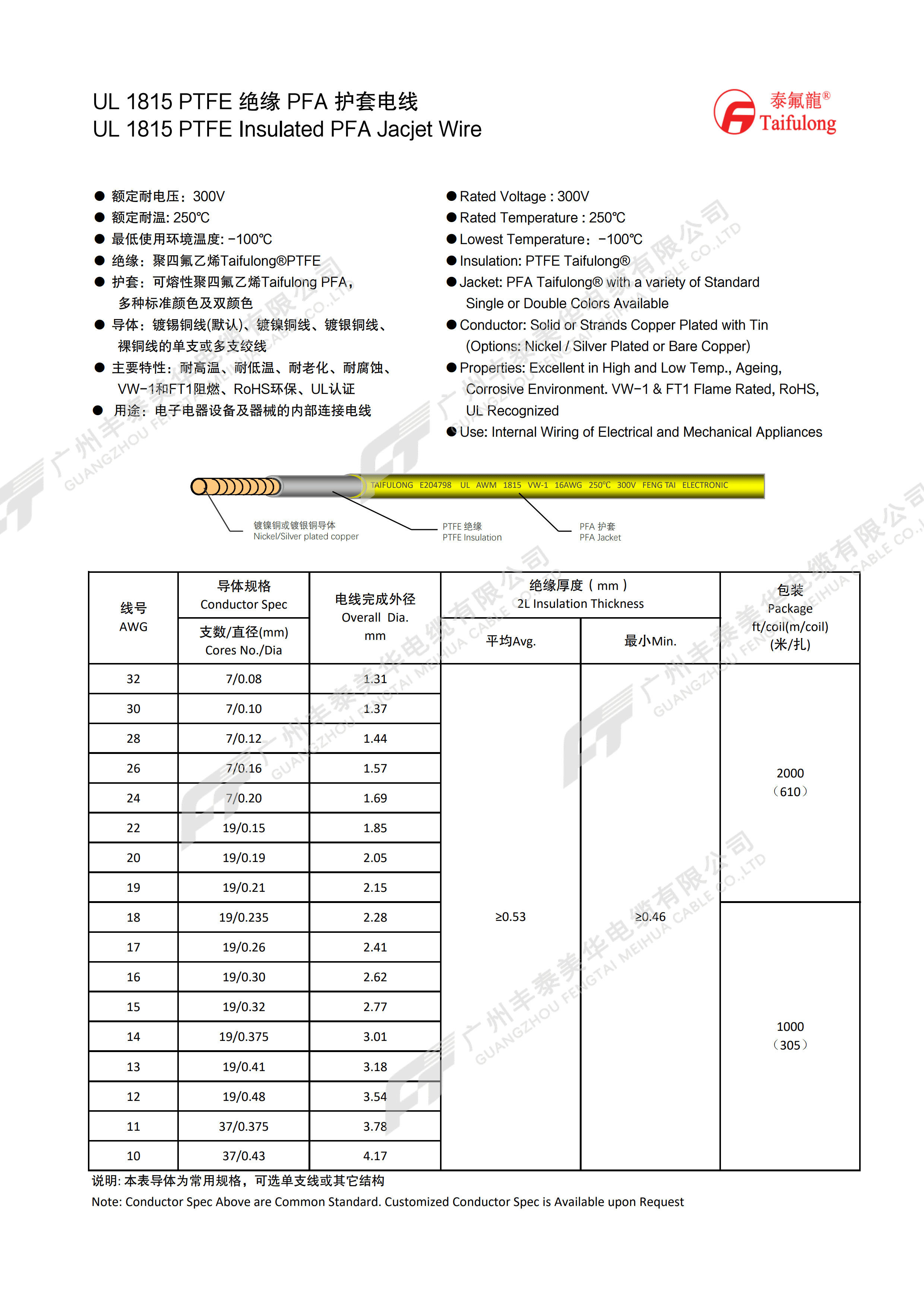 | 线号 AWG | 导体规格 | 电线完成外径 mm | 绝缘厚度(mm) | 包装 (米/扎) | |