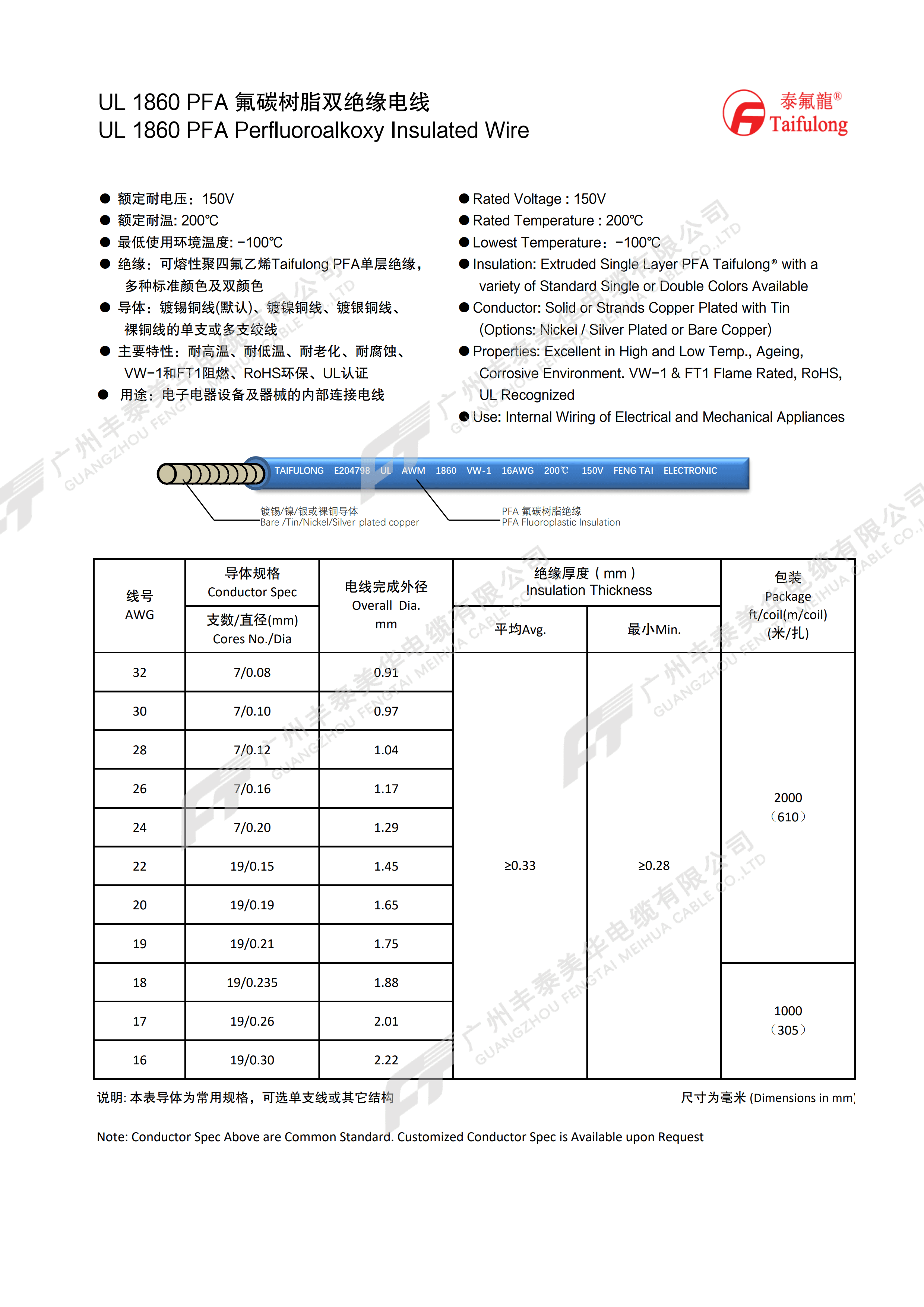 | 线号 AWG | 导体规格 | 电线完成外径 mm | 绝缘厚度(mm) | 包装 (米/扎) | |