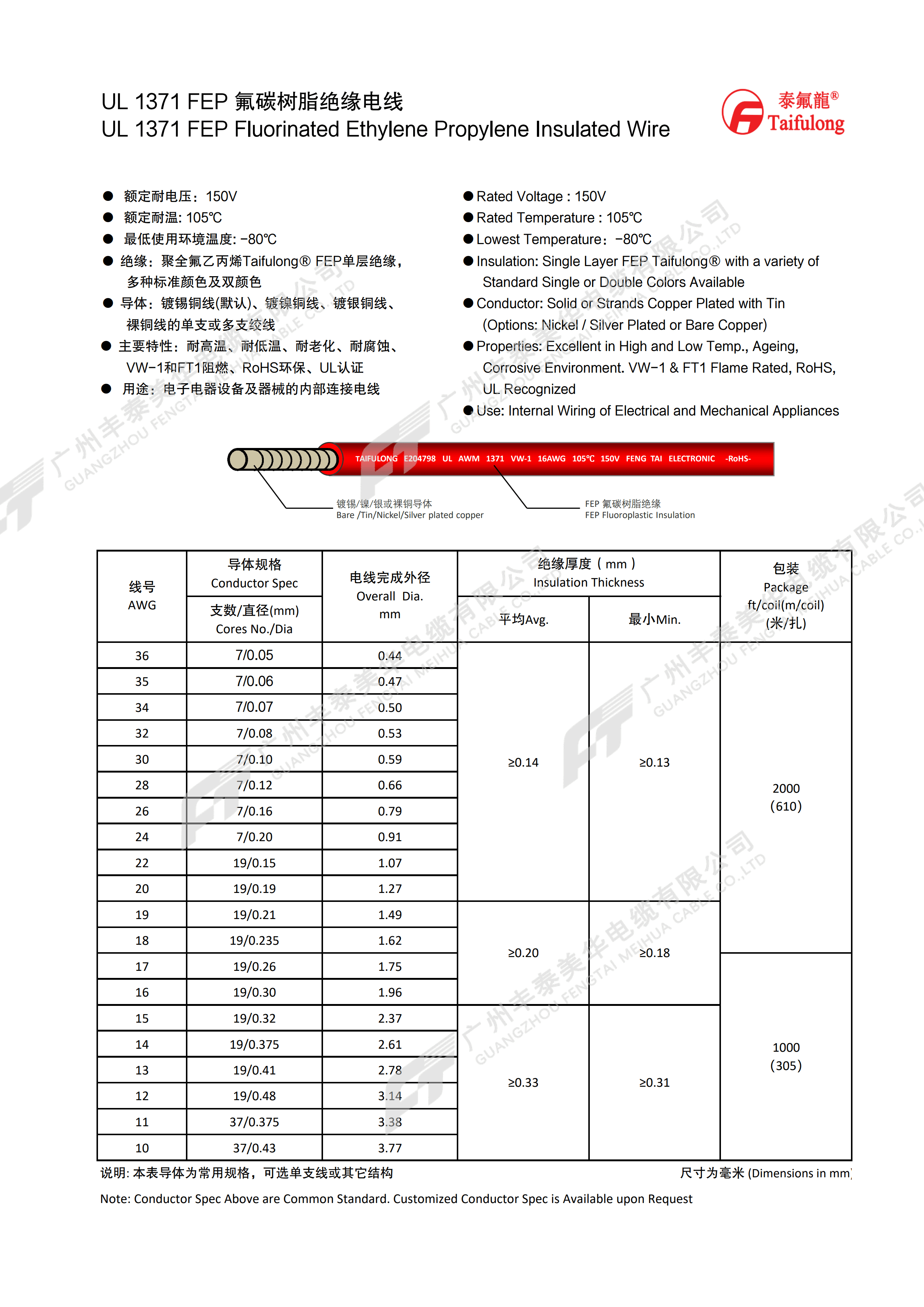| 线号 AWG | 导体规格 | 电线完成外径 mm | 绝缘厚度(mm) | 包装 (米/扎) | |