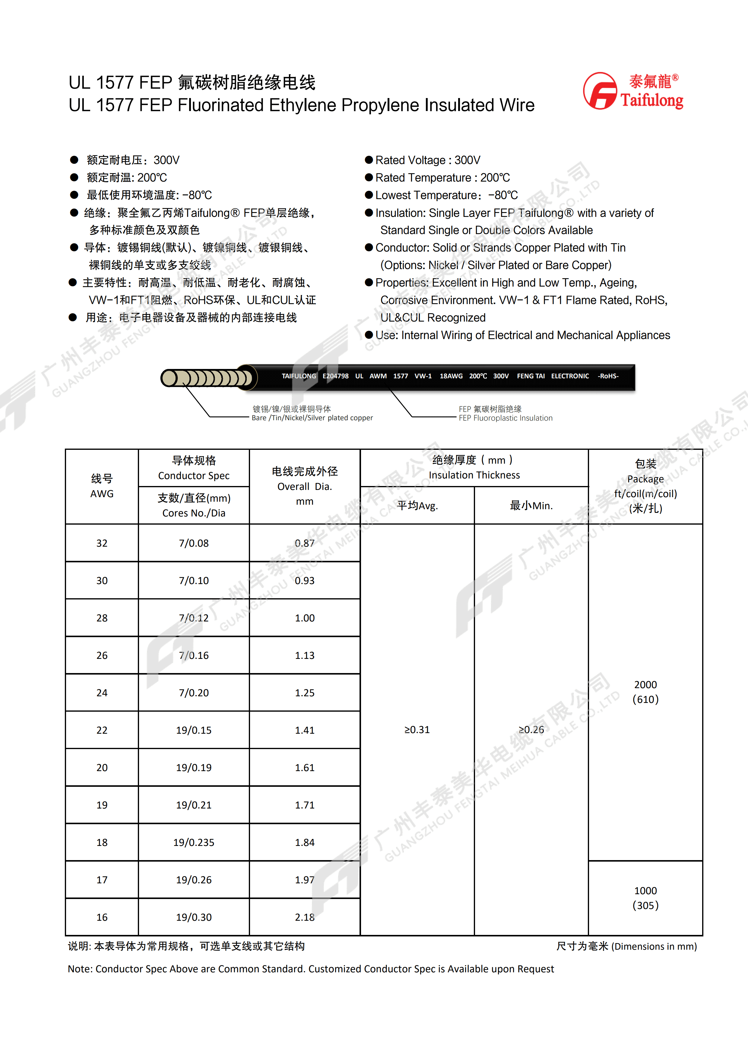 | 线号 AWG | 导体规格 | 电线完成外径 mm | 绝缘厚度(mm) | 包装 (米/扎) | |