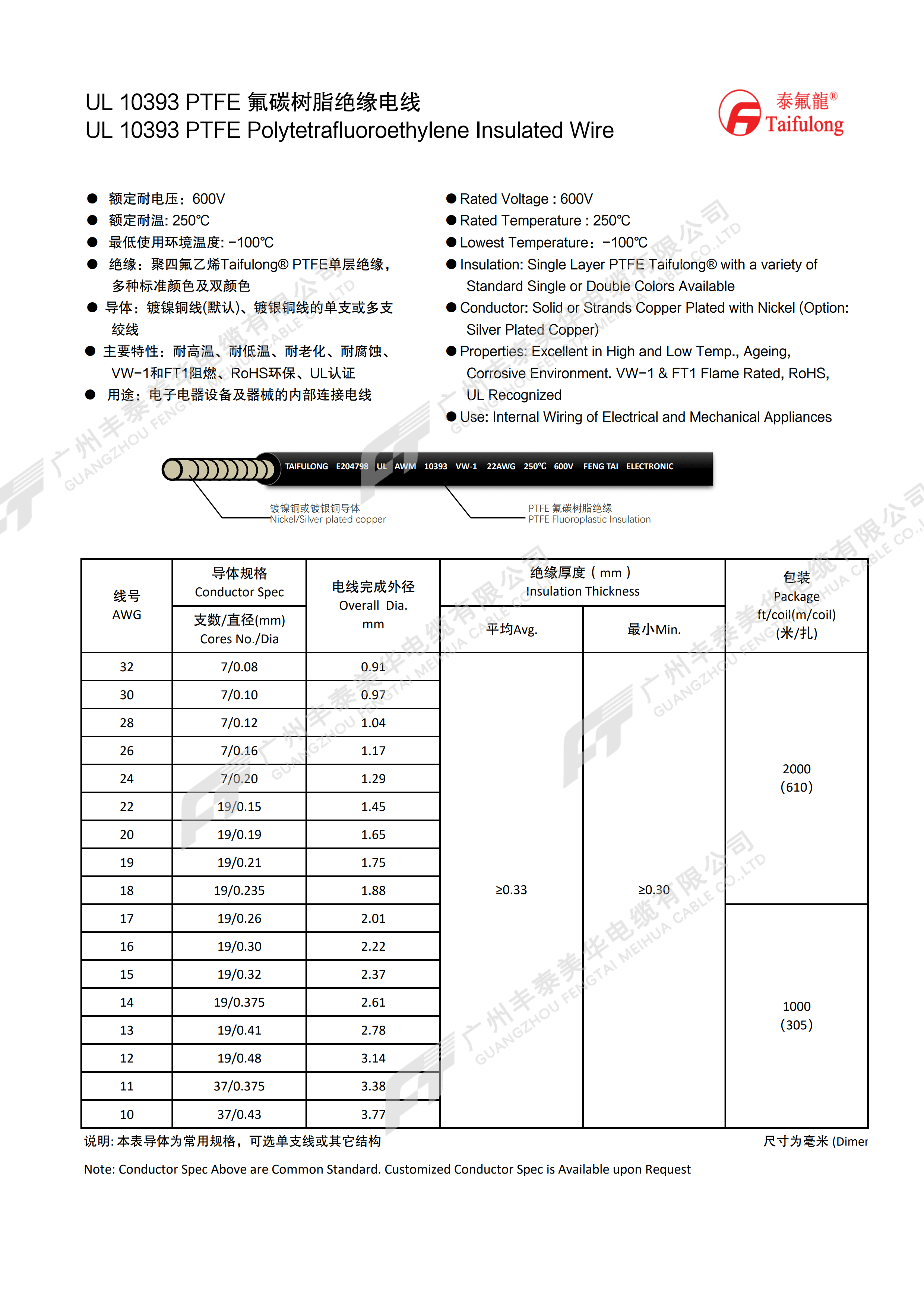 | 线号 AWG | 导体规格 | 电线完成外径 mm | 绝缘厚度(mm) | 包装 (米/扎) | |