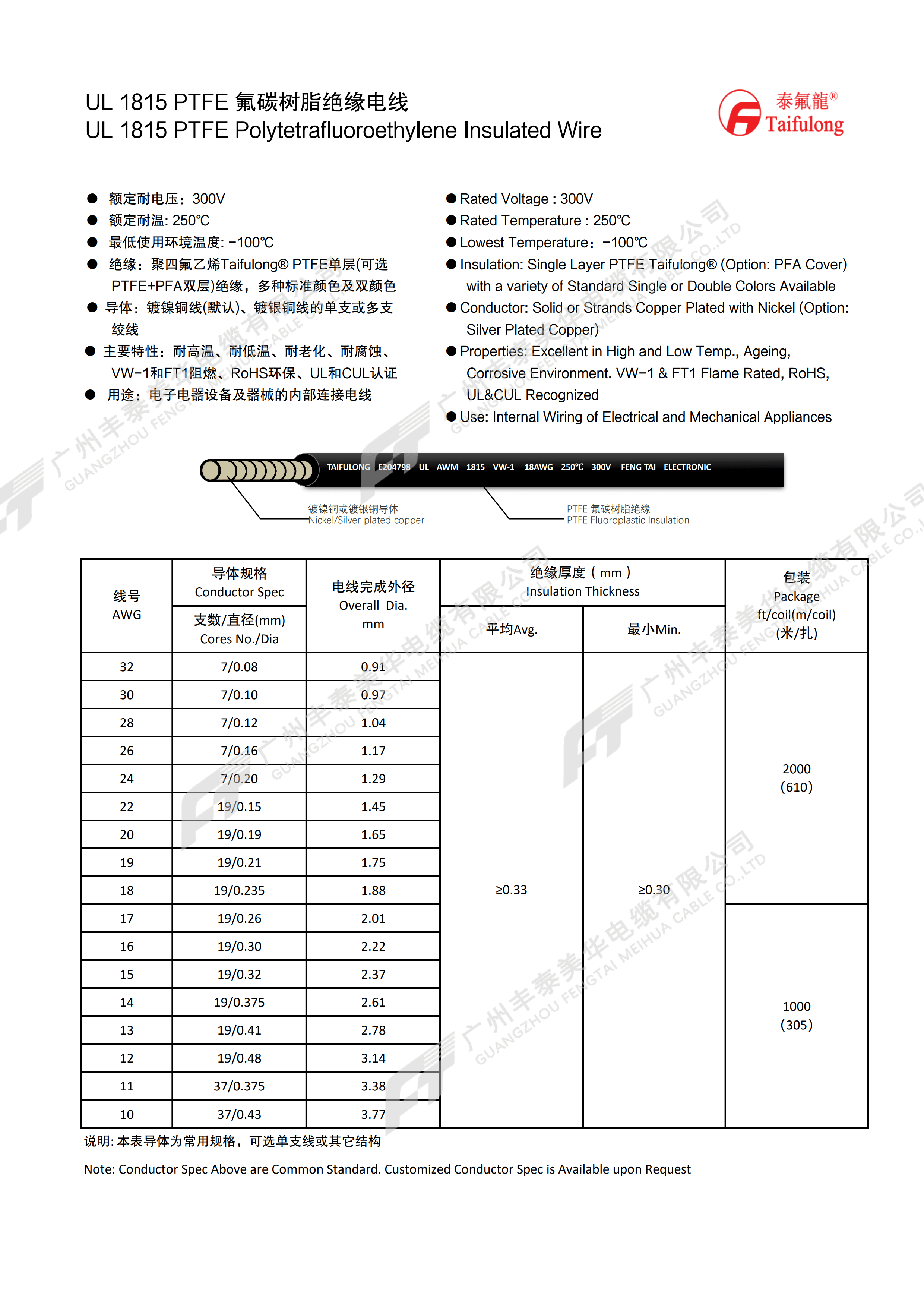 | 线号 AWG | 导体规格 | 电线完成外径 mm | 绝缘厚度(mm) | 包装 (米/扎) | |