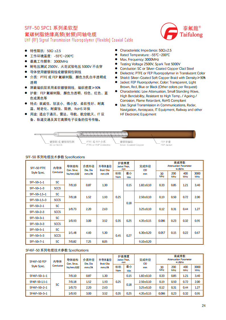 SF46F-50 FEP | 内导体 | 导体结构 No./mm±0.02 | 介质外径 mm±5% | 外导体直径 mm±6% | 护套厚度 mm | 完成外径 mm | 衰减常数 ≤dB/m | ||||