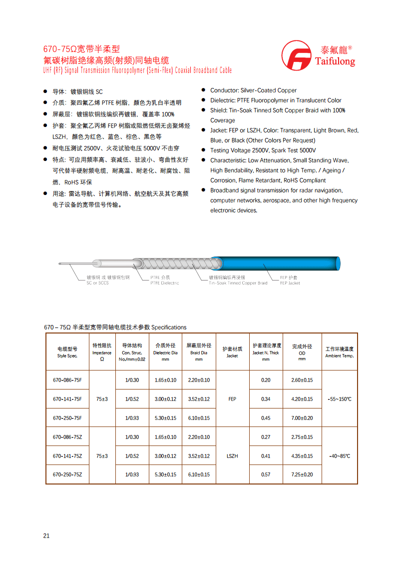 670-250-75F | 1/0.93 | 5.30±0.15 | 6.10±0.15 | FEP | 0.45 | 7.00±0.20 | -55~150℃ |