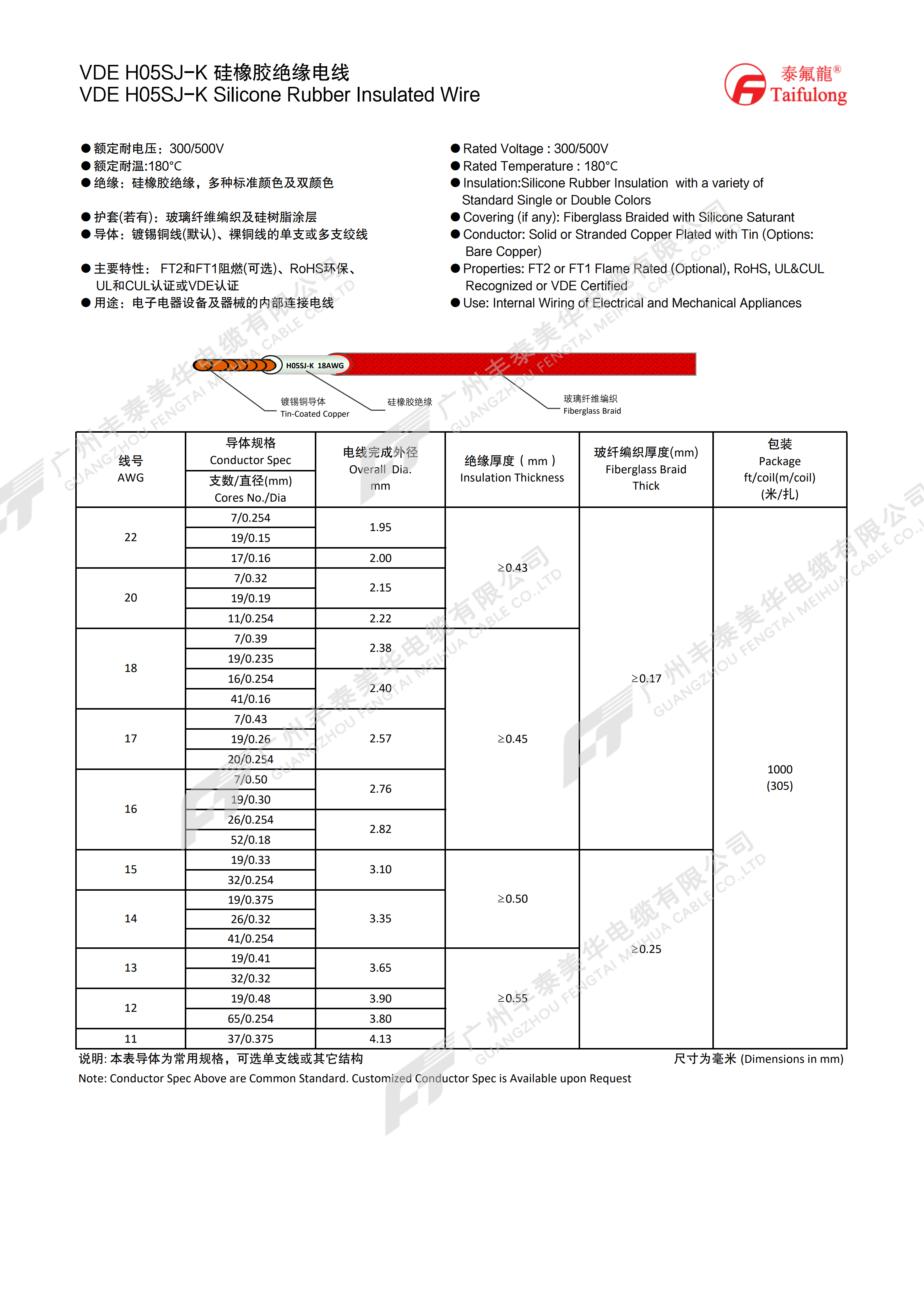 | 线号 AWG | 导体规格 | 电线完成外径 mm | 绝缘厚度(mm) | 玻纤编织厚度(mm) | 包装 (米/扎) |