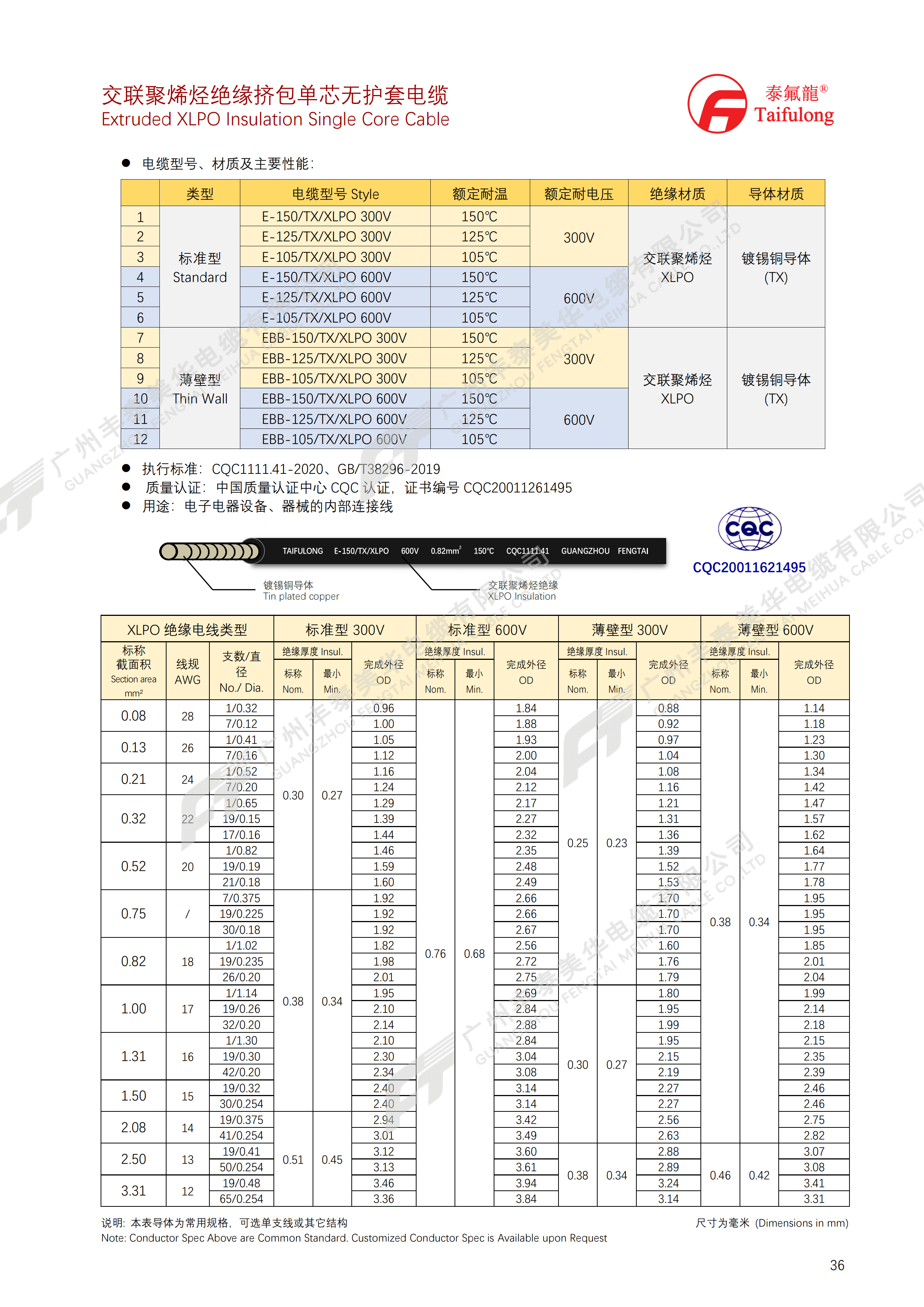 XLPO绝缘电线类型 | 标准型300V | 标准型600V | 薄壁型300V | 薄壁型600V | ||||||||||
